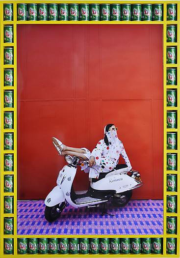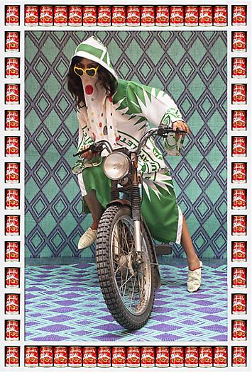 Turning to photography in the late 80s, Hajjaj is a master portraitist, taking studio portraits of friends, musicians, and artists, as well as strangers from the streets of Marrakech, often wearing clothes designed by the artist. These colorful and engaging portraits combine the visual vocabulary of contemporary fashion photography and pop art, as well as the studio photography of African artist Malick Sidibe, in an intelligent commentary on the influences of tradition in the interpretations of high and low branding and the effects of global capitalism