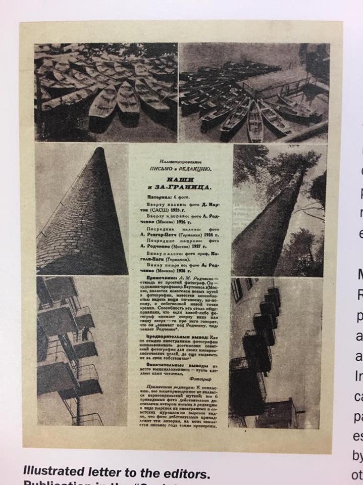 Rodchenko was looking for unexpected angles and perspective in photography in much the same way as Western European and American masters were also doing. He was even accused of plagiarism. In 1928 Soviet Photo magazine published an article called "An Illustrated Letter to the Editor". By comparing Rodchenko's angle shots of pine trees, houses with balconies, boats, etc. with similar works by Albert Renger-Patzsch, Laszlo Moholy-Nagy and others, the author wanted to convinced the public that Rodchenko was not doing something original, but simply imitating bourgeois formalists."Foreign photographers should be ashamed to use the achievements of Soviet photographers for their imperialist purpose; moreover, to present them as their own,"mockingly wrote the author, who signed the Illustrated Letter" as Photographer. (Picture2)