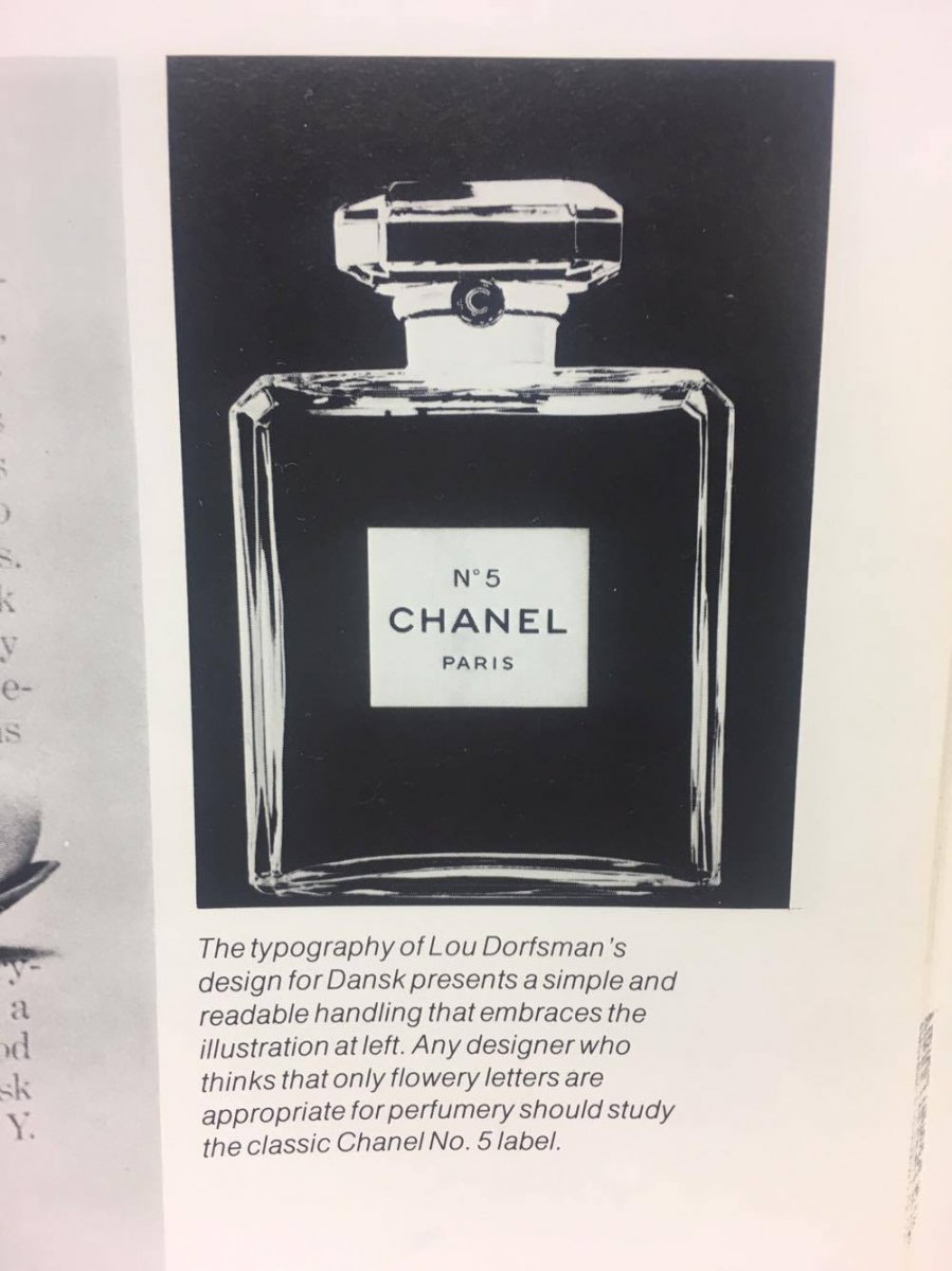 Perhaps too much thought has been given to the appropriateness of a typeface to the message. While there is valid ground for such considerations, qualities like age and tradition are not necessarily well served by old styles; nor is it essential to use a bold, structural letter simply because we are dealing with machinery. There is no low that prescribes a letter with a crisp serif for fashion or a flowing script letter for a perfume. A classic example of the successful typographic use of what seems like an inappropriate typeface is the label for Chanel No.5, with its sans serif letters that have been the hallmark of elegance for nearly fifty years. Special values can best be served by a total design concept that avoids imitation and suggests the values it serves in an original and creative way.