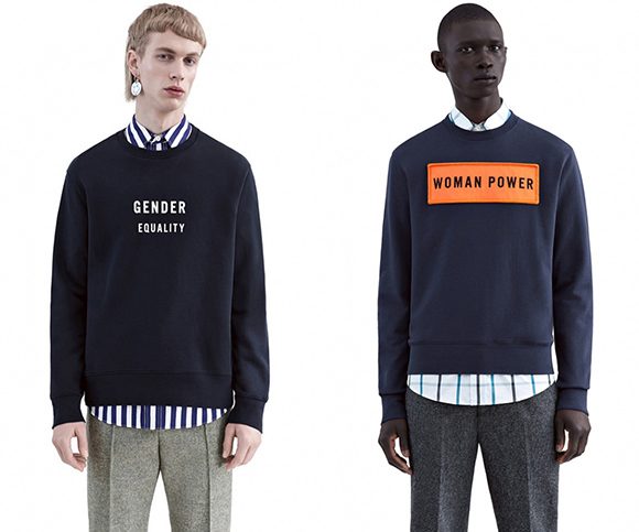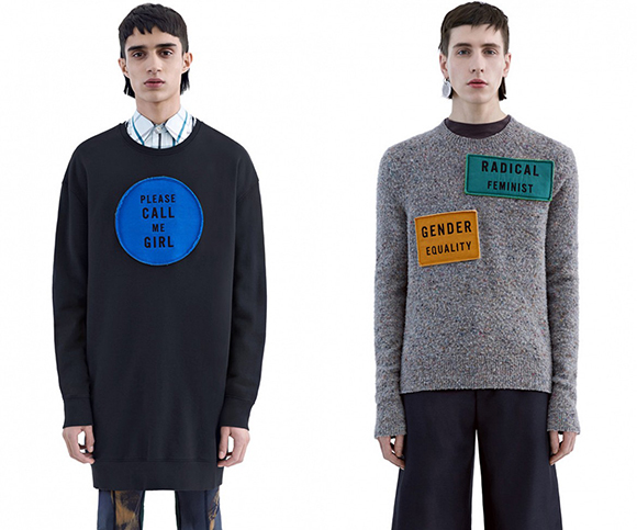 Their previous mens wear collection for SS 2015, which told a story with its androgynous, retro uniqueness. Erasing the line between male and female may not be the solemn purpose, but it is an inevitable reaction to trendsetter’s and powerful influencer’s actions. Their AW 2015 collection is no exception. This time though, it gets crystal clear with bold, statement prints, pieces emblazoned with pro-women, feminist patches and slogans such as “Woman Power” and “Radical Feminist”. They strongly show their view on gender equality and their non-acceptance of current injustices. Also on their website, you can see they’ve worked with unisex. The man model wears women wear on women's section.