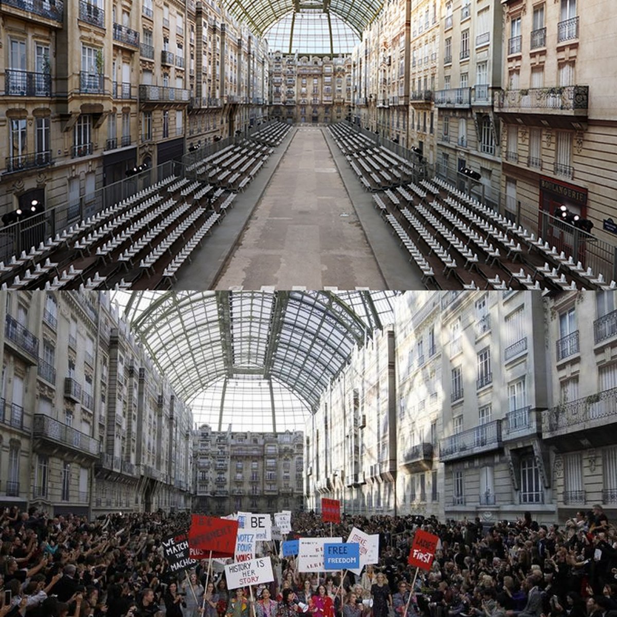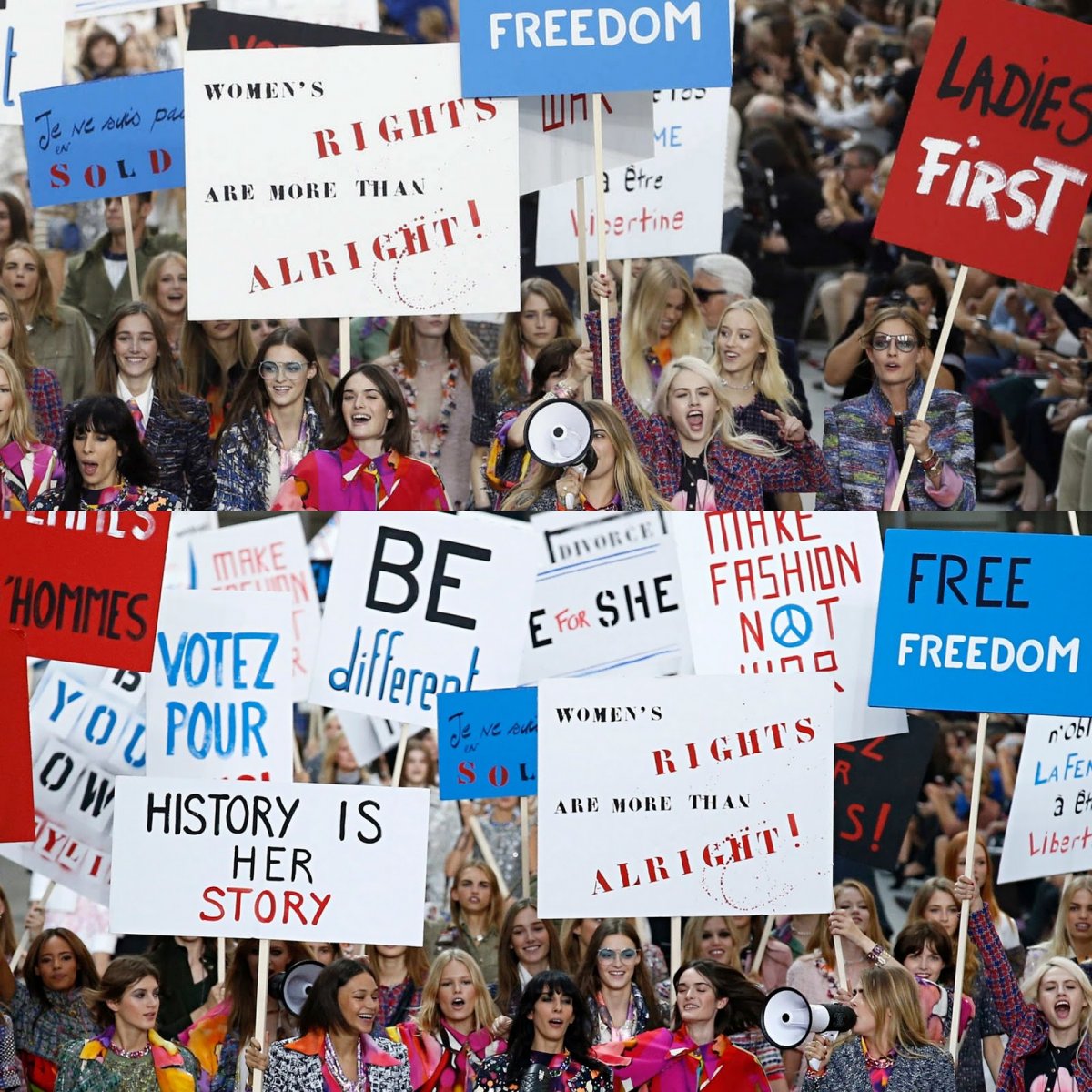 As previously stated, models flooded the runway with “He for She” picket signs-a blatant reference to Emma Watson’s UN speech on feminism. But the “Ladies First” sign and the we-want-to-be-chic shouts disclosed that the show was, in fact, not about Watson’s feminism. Since her speech advocated equality between males and females, signs such as, “Ladies First” and “History is Her Story", which place women above men, directly contrast “He for She”. Although one could argue that the female-over-male mantra mirrors New Age feminism, the contradicting signs, cries for “chic", and the nonsensical “Free Freedom” make the protest more theatrical and less political. The closing protest was not a fight for feminism. it was a display of the fight in the Chanel woman. The aforementioned independent, working woman full of sophistication and verve who still commands relevance in today’s world.