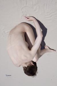From this picture, I cannot see the borderline between model and sands. Because of the color. "White" make person an invisible. also pose tells that he wants to be an invisible.