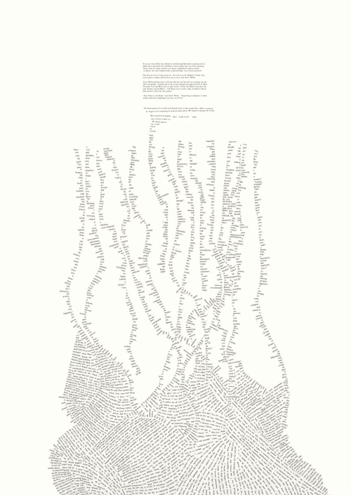 A continuing theme is his exploration of the hidden narratives found in canonical bodies of text. Works such as Darwin's Origin of the Species or classic nineteenth century children's literature are often subject to data mining and cut and paste techniques, playfully revealing meta narratives and visual assumptions.