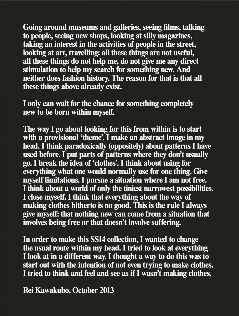The way I go about looking for this from within is to start with a provisional ‘theme.’ I make an abstract image in my head. I think paradoxically (oppositely) about patterns I have used before. I put parts of patterns where they don’t usually go. I break the idea of ‘clothes.’ I think about using for everything what one would normally use for one thing. Give myself limitations. I pursue a situation where I am not free. I think about a world of only the tiniest narrowest possibilities. I close myself. I think that everything about the way of making clothes hitherto is no good. This is the rule I always give myself: that nothing new can come from a situation that involves being free or that doesn’t involve suffering.